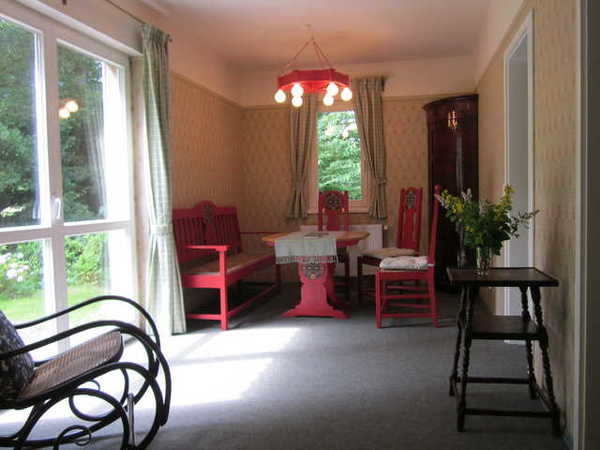 Die "Kleine Gartenwohnung" ist ebenerdig und hat einen Wohnraum mit Terrassentür zum Garten, Original Vogeler Sitzgruppe, ein Doppel-Schlafzimmer mit Himmelbett, ein Einzelschlafzimmer (Bett ohne Fußteil), ebenfalls mit Terrassentür zum Garten. Es gibt eine kleine, zum Wohnraum offene Küche und ein Duschbad.
