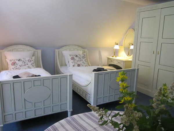 Das Appartement "Rosenzimmer" hat ein romantisches Schlafzimmer, das mit historischen Heinrich Vogeler Möbeln eingerichtet ist und hat zwei Betten (190 cm und 200 cm). Es gibt eine große Wohnküche mit Küchenzeile und ein Duschbad. Zugang über Treppe, kein Aufzug, Zustellbett möglich.