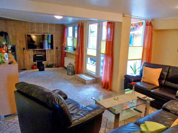 Die Ferienwohnung befindet sich im Erdgeschoss mit Außenterrasse. Zur Verfügung steht ein großes 27 qm Wohnzimmer mit Kamin, großem FlachTV, Soundanlage und Couchlandschaft; ein Schlafzimmer mit großem Wasserbett (2,20 m Breite), Schwebetürenschrank und FlachTV. Die Einbauküche bietet Ihnen einen Esstisch, FlachTV und großzügigen Kühlschrank mit Gefrierschrank. Das Badezimmer mit Fußbodenheizung ist ausgestattet mit einer ebenerdig begehbaren Dusche, einer Badewanne, WC und zwei Waschtischen. Eine Aufbettung für eine 3. Person ist durch ein Gästezustellbett im Wohnzimmer möglich.