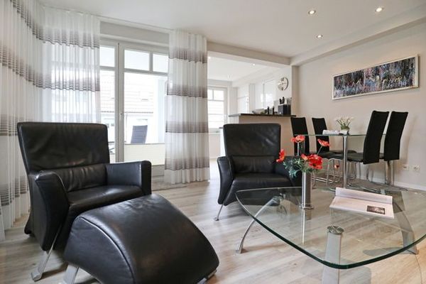 Die behagliche, komfortabel eingerichtete 2-Zimmer-Ferienwohnung befindet sich im 1. Obergeschoss und bietet auf 67qm Wohnfläche Platz für bis zu 4 Personen. Der gemütliche Wohn-/Essbereich ist mit zwei komfortablen Sofas, einem Relax-Sessel und einem großen Esstisch ausgestattet. Unterhaltung bieten ein Fernseher, DVD-Player, Videorecorder und eine Musikanlage. Den Internetzugang über WLAN nutzen Sie ohne Gebühr. Die separate Küche ist ideal für die Selbstversorgung und verfügt über Herd, Backofen, Kühlschrank mit Gefrierfach, Geschirrspüler sowie Toaster, Wasserkocher und Kaffeemaschine. Genießen Sie Ihre Mahlzeiten im Essbereich oder auf dem sonnigen, saisonal möblierten Balkon. Das geräumige Schlafzimmer bietet ein Doppelbett und einen Kleiderschrank, während das modernisierte Duschbad mit Waschtisch und WC ausgestattet ist. Eine Waschmaschine steht kostenfrei zur Verfügung, und Ihr PKW kann in der hauseigenen Tiefgarage geparkt werden, von wo aus Sie mit dem Fahrstuhl direkt zur Wohnungsetage gelangen.