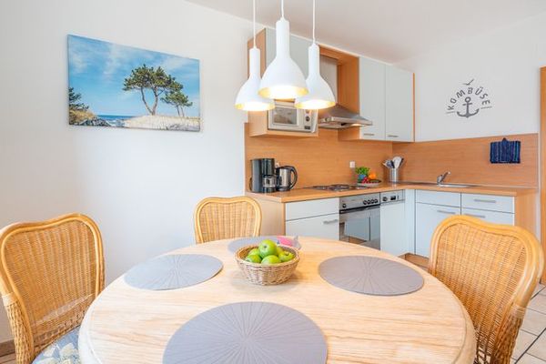 Der behagliche Wohnraum mit einer gemütlichen Sitzecke und einem Fernseher, sowie die komplett eingerichtete, offene Küche bieten einen guten Ort um sich gemeinsam in der Wohnung zu entspannen. Durch die zwei Schlafzimmer, gibt es jedoch auch einen ruhigen Rückzugsort um abzuschalten. Ein Schlafzimmer ist mit einem Doppelbett ausgestattet und eins mit zwei Einzelbetten. Das Badezimmer besitzt eine Dusche und ein WC. Auf dem Balkon können Sie gemütlich den Abend ein- und ausklingen lassen. WLAN ist vorhanden. Waschmaschine und Trockner können Sie gegen Entgelt verwenden. Natürlich stellen wir Ihnen ein PKW-Parkplatz vor dem Haus zur Verfügung. Zum feinsandigen, weißen Badestrand sind es nur ca. 3-4 Gehminuten.