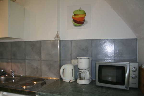 Ferienwohnung mit Wohnraum mit Couch, TV, Radio. Mini/Pantryküche mit Esstisch. 1 Schlafraum mit 2 hintereinander stehenden Einzelbetten (je 0.90x2m) und Durchgang zum Duschbad/ WC. Alternativer Schlafplatz: Schlafsofa (1.40x2m) im Wohnraum. Nichtraucher-Ferienwohnung, allergikerfreundlich, Haustiere sind nicht erlaubt.Hinweis: Steile Treppe ins Obergeschoss. Alle Zimmer haben schräge Wände.Im Gesamtpreis enthalten: Strom, Wasser, Heizung, Endreinigung, kostenloser PKW-Stellplatz auf dem Grundstück. Erstausstattung Toilettenpapier, Bettwäsche, Handtücher.