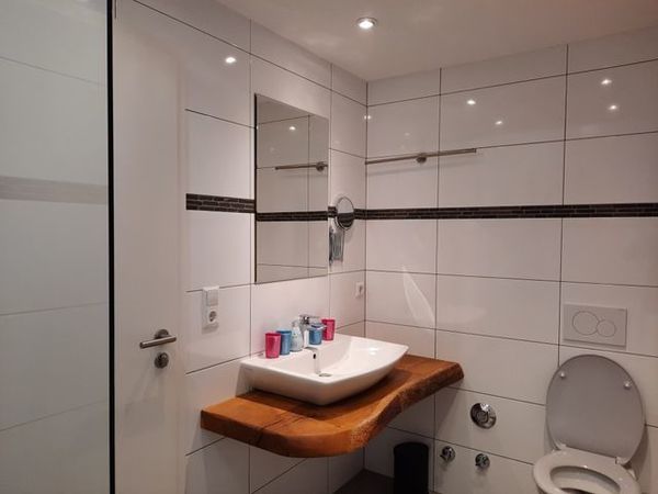 Diese liebevoll eingerichtete Wohnung hat großzügige 55m² Wohnfläche. Die Besonderheit dieser Wohnung, ist das Durchgangszimmer, dass ein Schlafsofa enthält. Falls bspw. Bekannte miteinander verreisen, die gerne getrennt von einander schlafen möchten, wäre das hier kein Problem. Gerne funktionieren wir das Sofa als Bett um. Die Wohnung ist voll ausgestattet mit Bettwäsche, Handtüchern, Kaffeemaschine, Toaster, voll eingerichteter Küche und auch Spülmaschine. Das Bad ist geräumig und mit einem Fenster versehen, auch in diesem Bad ist die Dusche ebenerdig.