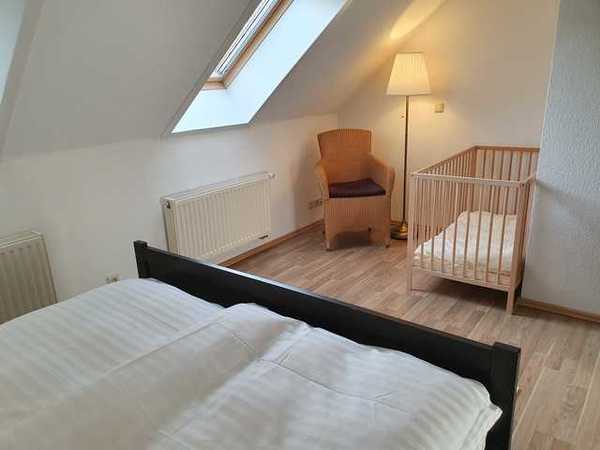Schöne großzügige Ferienwohnung über zwei Etagen im ehemaligen Pferdestall unseres Hofes. Im Erdgeschoss gibt es ein Schlafzimmer mit einem großen Doppelbett, ein Duschbad (mit Fön) und die Wohnküche (mit Spülmaschine), von der Sie einen Zugang zur privaten Terrasse haben.