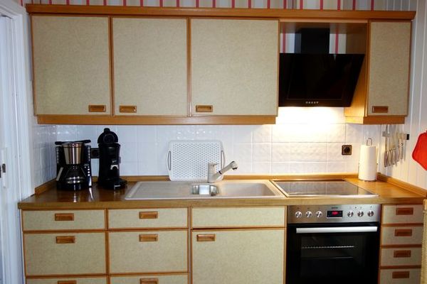 Die komplett ausgestattete Küche beinhaltet einen Kühlschrank, Induktionsherd mit Backofen, Geschirrspülmaschine, Mikrowelle, Kaffeemaschine, Kaffeepadmaschine (Dolce Gusto) Toaster, Wasserkocher.