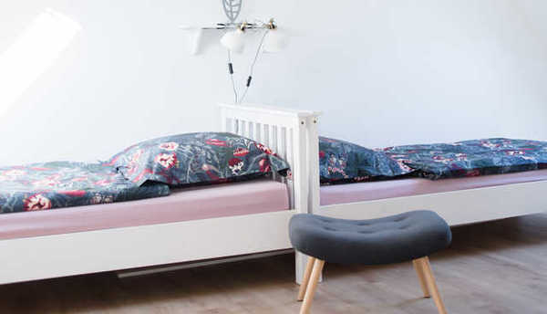- Zimmer 2: zwei Einzelbetten, 0,9 x 2,00 m inkl. Bettwäsche (die Betten können bei Bedarf zu einem Doppelbett zusammengeschoben werden)