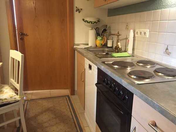 Die Ferienwohnung besteht aus einem Schlafzimmer, einem Wohnzimmer, einer kleinen Küche und einem Bad mit Dusche und WC. Das Schlafzimmer hat ein großes Doppelbett mit zwei Nachttischchen und einem dreitürigen Kleiderschrank sowie einer Kommode. Das Wohnzimmer ist ausgestattet mit einem Schlafsofa, einer Anrichte, einer Vitrine und einem runden Eßtisch aus schlichtem Stilholzmöbeln sowe einem großer Flachbildschirm. In der Küchenzeile ist ein Elektroherd mit Backröhre, ein Geschirrspühler und ein Kühlschrank integriert. Ein Wasserkocher, Kaffeemaschine und ein Toaster sind vorhanden. Ein kleiner Tisch mit zwei Stühlen findet ebenfalls dort Platz. Im Badezimmer mit Dusche, Waschbecken und WC ist ein Haarföhn, ein Kosmetikspiegel und ein Abfalleimer vorhanden. Handtücher, Geschirrtücher und Handseife liegen für Sie bereit.