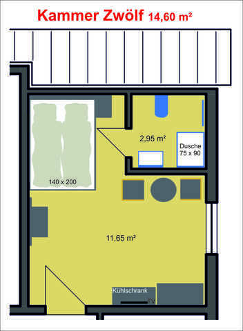 Die Kammer Zwölf ist ein kleines Doppelbettzimmer mit Duschbad in einer Gesamtgröße von 14,60 m².