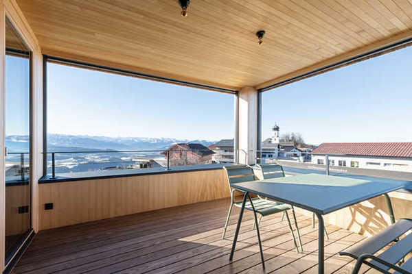 2 Schlafzimmer mit je einem Doppelbett (180x200cm) und Kleiderschrank, Wohn-/Esszimmer mit voll ausgestatteter Küche, gemütlichem Essbereich und einer bequemen Couch. Ein fugenloses Bad mit Dusche und WC. Garderobe. Das Herzstück ist der Wohn-/Essraum und der überdachte Balkon im Ur-Bregenzerwälder Stil {auch ‚Schopf‘ genannt}, der mit Panoramablick über die Bregenzerwälder, Schweizer und Allgäuer Berge zum Verweilen einlädt. Besondere und warme Atmosphäre durch gebürsteten Eichenboden, heimische Weisstannenwände und spezielles Lichtdesign.