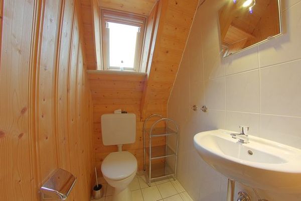 Im Obergeschoss befinden sich zwei weitere Schlafzimmer und ein WC mit Waschbecken. Ein Schlafzimmer mit Doppelbett und Gitterbett für ein Kleinkind und ein weiteres Schlafzimmer mit 2 Einzelbetten.