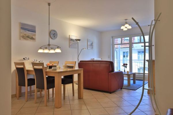 In dieser familienfreundlichen Ferienwohnung verbringen Sie einen erholsamen Ostseeurlaub. Die attraktive 2-Zimmer-Wohnung im 1. Obergeschoss ist bequem mit dem Fahrstuhl erreichbar und liegt nur 70 Meter zum feinsandigen Strand. Mit 54 qm bietet sie Platz für bis zu 4 Personen und verfügt über einen gemütlichen Wohn-/Essbereich mit Zugang zu einem sonnigen, saisonal möblierten Balkon. Zwei hochwertige Ledersofas, eines davon ausziehbar, sorgen für zusätzlichen Komfort, während ein Esstisch für gemeinsame Mahlzeiten bereitsteht. Zur technischen Ausstattung gehören ein Flachbild-TV, eine Musikanlage und kostenfreies WLAN. Die separate Küche ist mit modernen Geräten wie Ceranfeldherd, Backofen, Mikrowelle, Dunstabzug und Geschirrspüler ausgestattet. Eine Waschmaschine kann ebenfalls kostenfrei genutzt werden. Im Schlafzimmer erwartet Sie ein Doppelbett und ein geräumiger Kleiderschrank. Die Wohnung bietet ein modernes Duschbad sowie ein Gäste-WC. Ihr PKW findet Platz auf einem fest zugeordneten Stellplatz in der Tiefgarage, wo auch ein Fahrradabstellraum vorhanden ist. Bitte beachten Sie, dass es sich um eine Nichtraucherwohnung handelt und Haustiere nicht gestattet sind.