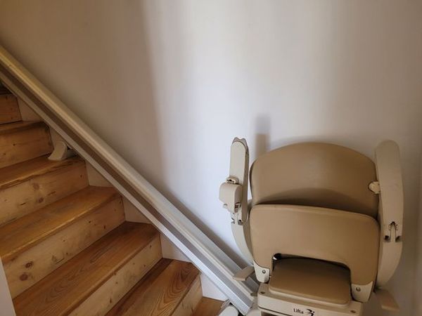 Der Eingang zur Treppe ist über 2 Stufen zu erreichen. Die Treppe ist mit einem Treppenlift ausgestattet und kann durch geheingeschränkte Personen genutzt werden. Die Dusche ist ebenerdig.