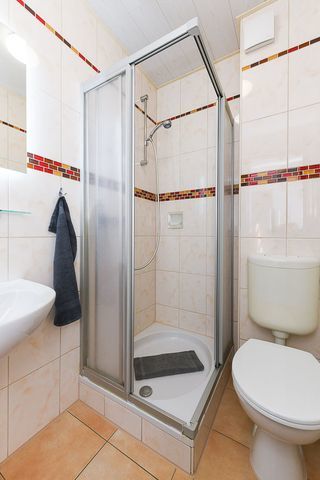 Größe ca. 35 Quadratmeter, Wohnraum mit integrierter Küche, Schlafzimmer, Badezimmer mit Dusche, Waschtisch und WC, Obergeschoss, optimal für 1 bis 3 Personen.