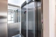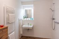 Informationen für Gäste mit Mobilitätseinschränkung: Der Zugang vom Parkplatz zum Hauseingang ist barrierefrei. Die Distanz vom Parkplatz zur Haustür beträgt etwa 30 Meter. Die Breite der Haustür beträgt 100 cm. Die Dichtigkeitsschwelle der Haustür ist etwa 1,5 cm hoch. Der Aufzug im Treppenhaus fährt jede Etage, auch die Saunalandschaft im Obergeschoss, an. Die Türbreite des Aufzugs beträgt 90 cm, die Tiefe beträgt 130 cm. Die Wohnungstür weist eine Breite von 90 cm auf. Die Breiten der Zimmertüren liegen bei 80 cm (Ausnahme: Türbreite von der Abstellkammer beträgt 70 cm). Im Badezimmer beträgt die Breite des Duscheingangs etwa 100 cm (faltbare Duschtür). Die Duschkabine hat eine Maße von 120 x 120 cm. Auf Wunsch kann ein Duschhocker kostenfrei zur Verfügung gestellt werden. Der Waschtisch ist unterfahrbar. Haltegriffe sind nicht vorhanden. Das Bett weist eine Höhe von 55 cm auf und ist nicht unterfahrbar. Die Terrassentür im Wohnzimmer ist zweiflügelig und lässt sich auf eine Breite von etwa 160 cm öffnen. Im Schlafzimmer lässt das an der Terrassentür befindliche Fliegengitterschiebeelement die Tür auf eine Breite von etwa 70 cm öffnen. Die Schwelle von der gepflasterten Terrasse zur Rasenkante beträgt etwa 15 cm. Der Saunabereich im Dachgeschoss ist mit dem Aufzug erreichbar. Im Dachgeschoss ist eine Sauna mit dem Rollstuhl befahrbar, die Türbreite beträgt 90 cm. Für das Betreten der Dachterrassen müssen zwei Stufen passiert werden. Das Betreten des Südbalkons im Dachgeschoss ist barrierefrei möglich. Die Freizeitbereiche im Untergeschoss des Nachbarhauses sind komplett barrierefrei gestaltet. Die Türbreiten liegen bei 90 cm.