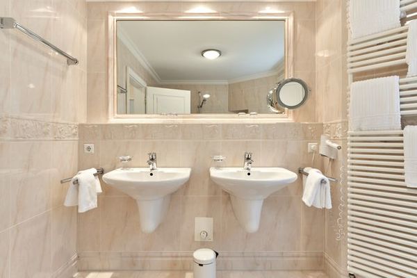 Zwei Badezimmer, einmal mit Wanne, Doppelwaschbecken und WC und ein Duschbad mit WC.