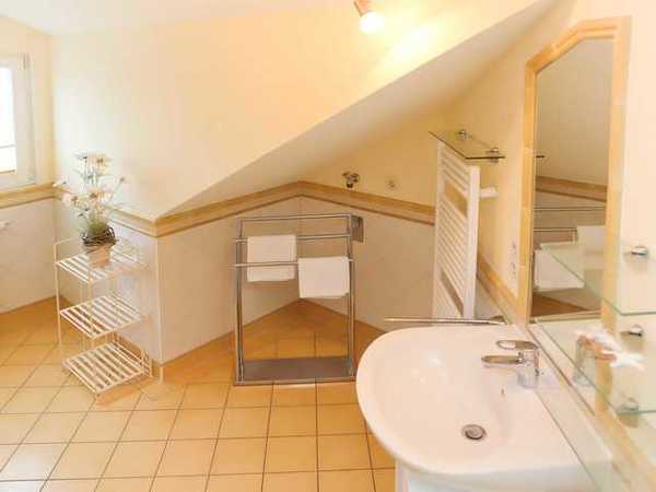Sie wohnen in einer hochwertig eingerichteten 4-Raum-Ferienwohnung von 93 m² Größe, die sich im ersten Dachgeschoß befindet. Das Wohnzimmer ist ausgestattet mit einer bequemen Sitzgarnitur, Essecke, Flatscreen-TV und Dolby Surround-Anlage mit DVD Player. Vom Wohnraum aus betreten Sie die Südwestdachterrasse, die zum Entspannen einlädt. Die Küche ist ausgestattet mit Geschirrspüler, Mikrowelle, Ceranfeld mit Backofen u.v.m. Die Wohnung verfügt über zwei Schlafzimmer mit Doppelbett, Kleiderschrank und Flatscreen-TV (vom großen Schlafzimmer können Sie den Südostbalkon betreten) sowie ein Schlafzimmer mit Etagenbett. Das Bad mit Eckbadewanne, Dusche und WC vervollständigt das Gesamtbild dieser Wohnung.