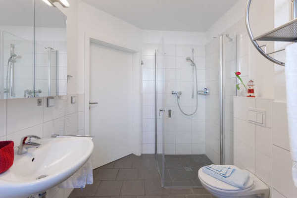 Das helle, geräumige Badezimmer ist mit Dusche, WC und Waschmaschine ausgestattet praktisch und komfortabel, auch für längere Aufenthalte.