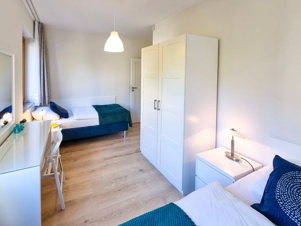 Sie besteht aus zwei Schlafzimmern und einem geräumigen Wohnzimmer mit Balkon. Die Fenster der beiden Schlafzimmer sind nach Norden zum Innenhof gerichtet. Eine Schlafzimmer ist mit einem Doppelbett, Kleiderschrank und einem Nachttisch mit Lampen ausgestattet und ein Frisiertisch, zweite Schlafzimmer mit zwei Einzelbetten.