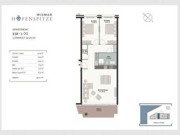 Das perfekte Urlaubsdomizil für unsere Gäste, die Wert auf großzügiges, luxuriöses Wohnen legen. Das 3-Zimmer-Appartement Hafenspitze 32 verwöhnt Sie mit einer Wohnfläche von 93qm. Eine Belegung ist mit bis zu 4 Personen möglich. Die Ferienwohnung besitzt zudem eine sonnige Loggia im Hafenblick, wobei elektrisch bedienbare Außenrollos für sommerlichen Wärmeschutz sorgen. Der einladende Wohn-Essbereich bietet eine komfortable Möblierung mit bequemer Sitzgarnitur und einem Esstisch.