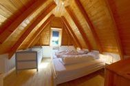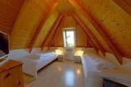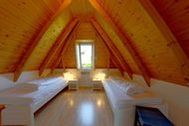 Im Obergeschoss befinden sich zwei Schlafzimmer mit Laminatböden und ein WC mit Waschbecken. Ein Schlafzimmer mit Doppelbett (180x200) und Babybett, sowie ein weiteres Schlafzimmer mit 2 Einzelbetten (100x200) und ebenfalls Flat-TV.