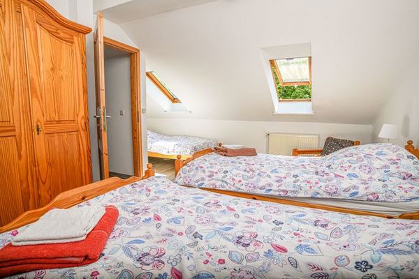 Die Ferienwohnung besteht aus einem Wohnzimmer mit Küche und Esstisch. Oben befinden sich das Schlafzimmer mit drei Betten und dem Bad (Gesamtgröße ca. 53 qm). Die Fußböden wurden mit hochwertigen Vinylboden ausgelegt.