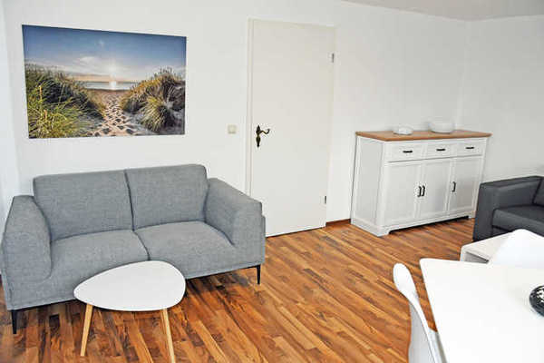 Über einen Flur kommen Sie in den Wohnraum. Hier stehen eine Couch, ein Tisch mit Sesseln und ein modernes Flachbild-TV-Gerät. Die Küchenzeile im Wohnbereich, ist mit Elektroherd mit Ceranfeld, Backofen, Kühlschrank mit Gefrierfach, Kaffeemaschine, Wasserkocher, Toaster komplett ausgestattet. Hier steht auch ein Esstisch mit Stühlen.
