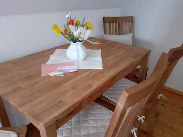 Für alle Gäste ist die Nutzung der voll ausgestatteten Küche gewährleistet. Diese befindet sich im gegenüberliegenden Gebäude vom Haupthaus, wo auch das Frühstück in der "Guten Stube" eingenommen werden kann. Ein Kühlschrank für unsere Gäste befindet sich in der Diele.
