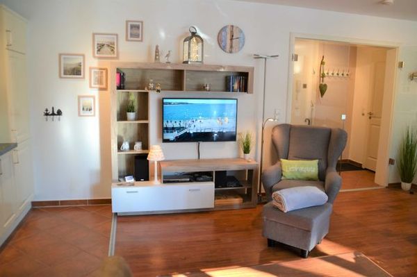 Mit dem Fahrstuhl erreicht man das moderne, komfortabel eingerichte Appartement in der 1. Etage, das über einen offenen Wohnbereich mit gemütlicher Couch und einem bequemen Ohrensessel mit Hocker verfügt, sowie über den integrierten Essbereich mit Tisch und 4 Stühlen. Es erwartet den Gast eine moderne Ausstattung mit internetfähigem Flat-TV, WiFi, Blu-ray-/DVD-Player (Panasonic) und Musikanlage (Teufel).