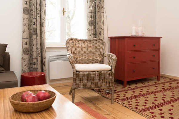 Im 1. Stock gelegene 70m2 Wohnung mit dem Namen "Red Otto" bietet ein Schlafzimmer mit Doppelbett und Direktzugang zum Badezimmer. In der separaten Küche gibt es einen 100 Jahre alten Dauerbrandofen. Das 30m2 große Wohnzimmer mit Doppelschlafcouch ist mit einem Pelletofen ausgestatten. Im Badezimmer mit Badewanne gibt es eine Fußbodenheizung. 100 Jahre alte Schiffböden, gemütliche Sofas und Lesesessel, Flachbildschirm mit SAT-Anschluss und DVD-Player, sowie eine Auswahl von Filmklassikern für verregnete Abende. Saunazugang und Gartenbenützung inklusive. Die Küche umfasst alles was das Herz begehrt. Wohnzimmer sumptously red - perfekt, um endlich den 1990er Bordeau zu köpfen.