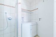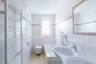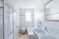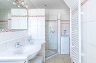 Das hell geflieste Bad auf dieser Etage ist mit zwei Waschtischen, WC, Dusche und Badewanne ausgestattet. Gebührenfrei können Sie hier außerdem Waschmaschine und Trockner nutzen. Das Fenster spendet Tageslicht und erleichtert das Lüften, z.B. nach dem Duschen oder Baden.