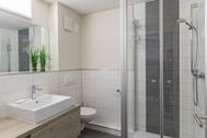 Das Bad ist gefliest und mit einer Dusche und WC ausgestattet.