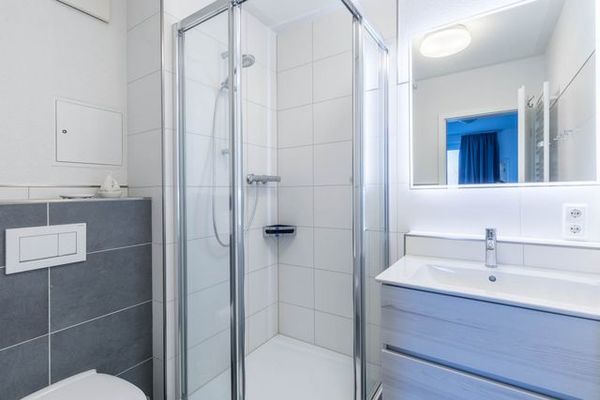 Im hell gefliesten Bad befinden sich eine Dusche, Waschbecken und WC.