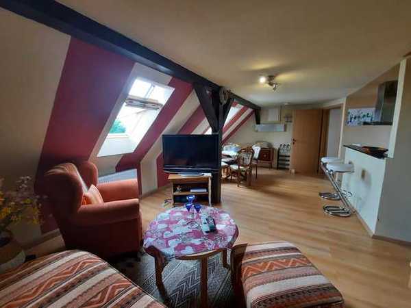 Die Ferienwohnung im Obergeschoss empfängt Sie mit einem großen Wohnbereich mit Couch, FlachTV, Wohnküche und Esstisch. Vom Wohnzimmer gelangen Sie in das große Badezimmer mit Badewanne, Waschtisch und WC. Vom Badezimmer aus kommen Sie durch einen kleinen Zwischenflur in beide Schlafzimmer. Das Schlafzimmer eins bietet Ihnen ein Doppelbett (0,90 m x 2,00 m p. P.), Nachttische, Leselampe und Kleiderablage. Das Schlafzimmer zwei verfügt über 1 franz. Bett (0,90 m x 1,40 m p. P.), einen Nachttisch, eine Leselampe und Kleiderablage. In beiden Schlafzimmer ist Auslegware verlegt und in allen anderen Bereichen Laminat oder Fliese. Die Ferienwohnung verfügt über ein voll ausgestattete Küche mit einem Mini-Gefrierfach.