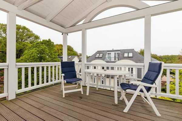 Das geräumige und gemütliche Wohn-/Esszimmer verfügt über eine Sitzgruppe mit bequemer Couch, 2 Sesseln und Couchtisch, eine zusätzliche kleine Leseecke mit Tisch und 2 Stühlen, einen separaten Esstisch mit 4 Stühlen sowie eine Kommode. Vom Wohnzimmer aus haben Sie direkten Zugang zu dem großen (ca. 12 m²) überdachten Balkon (nach Süd-Osten ausgerichtet) mit Balkonmöbeln, Sonnenliegen und seitlichem Meerblick - hier sitzen Sie entspannt und gemütlich mitten im Grünen und können bei einem guten Glas Wein die lauen Sommernächte über den Dächern von Kühlungsborn genießen