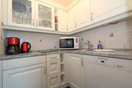 moderne, voll ausgestattete Küche mit Ceranfeld, Backofen, Mikrowelle, Spülmaschine, Kühlschrank mit Eisfach, Filter-Kaffeemaschine, Wasserkocher und Toaster.