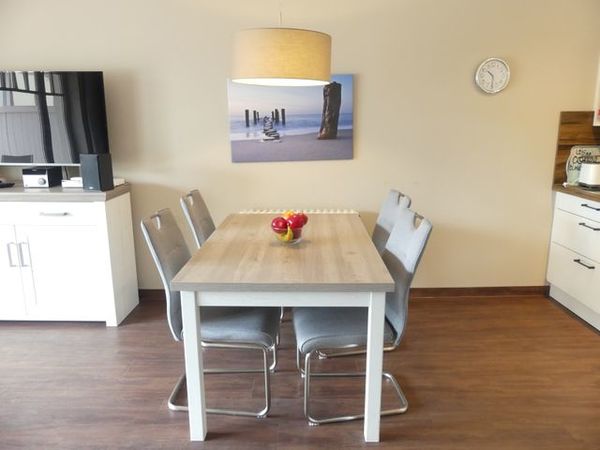 Wohnzimmer: Große Couch (Eck-Schlafcouch für 1 Erwachsenen oder max. 2 Kinder), 2 Sessel, Sat-TV mit gr. Bildschirm, WLAN-Internetanschluss, großer Essplatz mit 4 Stühlen
