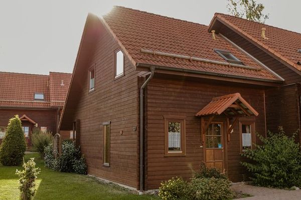 Die Doppelhaushälfte in Holzbauweise bietet auf rund 65 m² Wohnfläche Platz für bis zu fünf Personen. Im Erdgeschoss befinden sich ein Wohn- und Schlafbereich mit Couch, ein separater Essplatz, SAT-Flachbild-TV, HiFi-Anlage, eine voll ausgestattete Kochnische mit Geschirrspüler und Mikrowelle, ein Abstellraum sowie ein Gäste-WC.