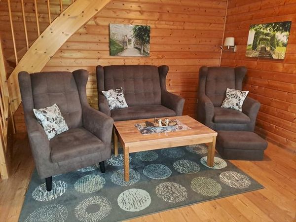 Sie wohnen in einer 3-Zimmer-Doppelhaushälfte in Holzbauweise für bis zu 5 Personen auf ca. 65 m² Wohnfläche. Im Erdgeschoss finden Sie einen geräumigen Wohnraum mit bequemer Couchgarnitur, separatem Essplatz, Flachbild-TV, Hifi-Anlage, vielen Gesellschaftsspielen und einer Bücherauswahl, eine voll ausgestattete Küchenzeile mit Geschirrspüler und Mikrowelle, Abstellraum und ein separates Gäste-WC.