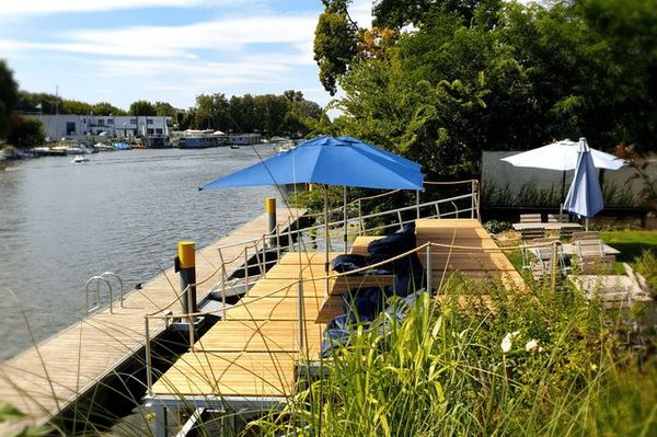 Zu jeder Ferienwohnung gehört die große Liege-/Spielwiese am Havelufer mit direktem Zugang zur hauseigenen Schwimm-/Badesteganlage, welche mit Badeleiter und einer Freibordhöhe von 20 cm errichtet wurde. Das ermöglicht Ihnen ein bequemes Ein- und Aussteigen aus ihrem Kanu bzw. Ruderboot. Weiterhin ist dort direkt neben dem übergroßen Natursteintisch (ca. 5 x 1,20m) der Grillplatz.