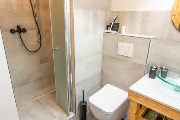 Der Küchenbereich ist zweigeteilt. Im Essbereich befinden sich der Kühlschrank mit Gefrierfach, Wasserkocher, Toaster und Kaffeemaschine. Der Rest der Küche ist komplett ausgestattet mit einem modernen Induktionsherd, einer Spüle, Geschirr, Besteck, Gläser und Kochtöpfen.