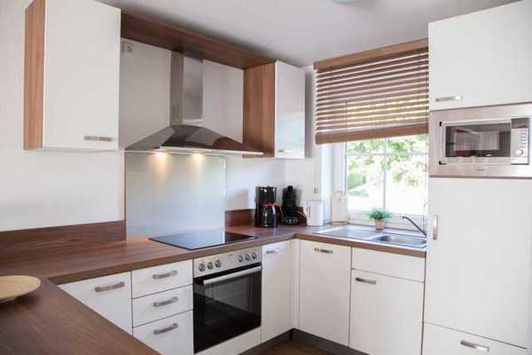 Die offene Küche ist hervorragend ausgestattet mit Backofen, Spülmaschine, Kühlschrank mit Tiefkühlfach, Mikrowelle, Kaffee + Senseo-Maschine, Eier-/Wasserkocher, Toaster, Mixer, Waffeleisen. Geschirr und Gläser sind ausreichend vorhanden. Der Essbereich lädt mit großem Tisch und gemütlichen Stühlen ein.