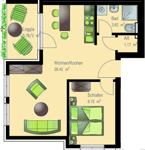 - Wohnzimmer: gemütliche Eck-Schlafcouch Textil (160x200), TV-Flachbild, TV-Bank, Korbsessel, Tisch, Radio mit CD und Halterung MP3-Player, DVD-Player