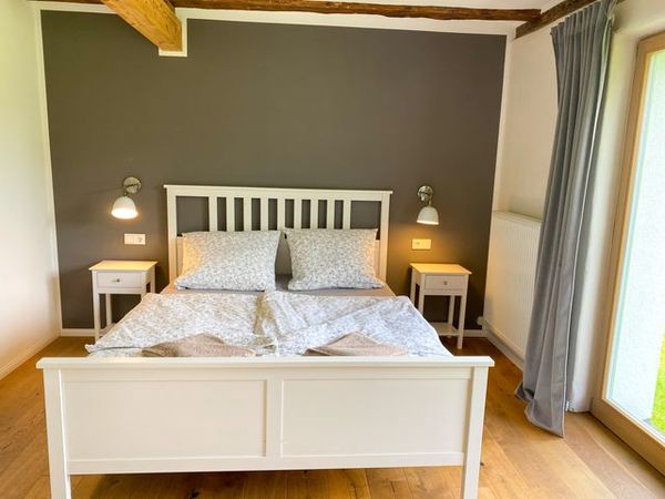 Ihre Ferienwohnung bietet Ihnen einen wunderschönen offenen Wohn- und Küchenbereich mit einer voll eingerichteten Küche inkl. Spülmaschine und Backofen für bis zu 4 Personen. Ein komfortables Sofa, das auch noch als Schlafsofa (140x200) umfunktioniert werden kann, lädt zu gemütlichen Abenden ein. Über zwei Stufen erreichen Sie einen kleinen Flur, von wo aus das Badezimmer mit Dusche und WC sowie das großzügige Schlafzimmer mit Doppelbett (180x200) erreichbar ist. Auch hier erwarten Sie altes Fachwerk mit lehmverputzten Wänden und moderne Einrichtungselemente. Im Badezimmer steht Ihnen eine ebenerdige Dusche zur Verfügung sowie Tageslicht.