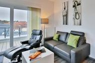 Stilvolle 2-Raum-Penthouse-Wohnung mit Seesicht vom Balkon. (ca. 51m²), 3.Etage, 1 Schlafzimmer mit Doppelbett und Außenjalousien,, 2xDusche/WC, Wohnzimmer mit vollausgestatteter Küchenzeile (Back., Mikrow., Geschirrspüler) 1xSAT-TV, DVD-Player, Sonoro-HiFi-Anlage, Abstellraum im Dachgeschoss, kostenfreies W-Lan, Balkon (süd/ost), Personenaufzug, reservierter Pkw-Stellplatz i.d. Tiefgarage #14, Nichtraucher.