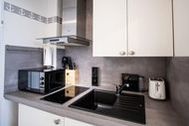 Die kleine Küchenzeile ist mit Induktionsherd, Mikrowelle mit Grillfunktion, Spülmaschine, Kühlschrank und Abzugshaube