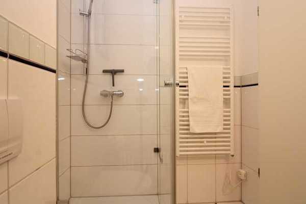 Das moderne und freundliche Badezimmer verfügt über eine Dusche mit niedrigem Einstieg und Echtglas-Duschabtrennung, Waschbecken, WC, Kosmetikspiegel, Föhn, einen Handtuch-Heizkörper sowie ausreichend Ablagemöglichkeiten.