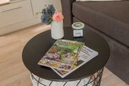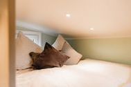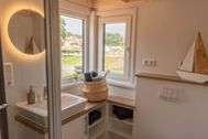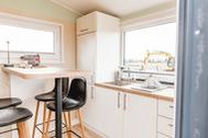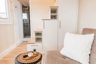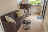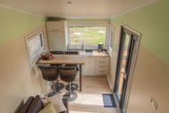 Modern und komfortabel ist unser ganz neues Tiny-Haus und bietet auf 23 qm Platz für bis zu vier Personen. Unten gibt es eine komplett ausgestattete Küchenzeile mit Herd und Kühlschrank, eine bequeme Schlafcouch (1,40 cm) und ein Bad mit Dusche und WC. Über eine Treppe errreicht man die gemütliche Schlafempore.