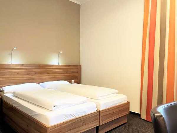 Das Doppelzimmer ist 22 m² groß und ist mit einem Doppelbett und Leselampen ausgerüstet. Zur weiteren Ausstattung gehört ein Schreibtisch mit einer Tischlampe, ein zusätzlicher Sessel sowie ein Kleiderschrank für Ihre Garderobe. Das modern eingerichtete Bad verfügt über ein WC, Waschtisch und einer begehbaren Dusche. Auf Anfrage ist ein Babybettchen zustellbar.