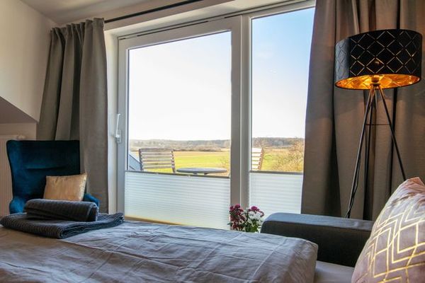 Die Ferienwohnung Panoramablick 2 im Landhaus Wiesenblick in Zarrendorf ist für bis zu 6 Personen geeignet und verfügt auf 75m² Fläche über 1 Wohnbereich mit offener Küche und Essbereich, sowie einer Schlafcouch die zu einem vollwertigen Bett (160x200) umgebaut werden kann. Die zwei separaten Schlafzimmer beinhalten jeweils ein Doppelbett (160x200) und eine Garderobe. Das Badezimmer ist abschließbar und mit einer ebenerdigen Dusche, Badewanne, Waschbecken und WC ausgestattet. Die Küche enthält neben einer Spüle, Geschirrspüler, Backofen, Cerankochfeld, Kühlschrank mit Gefrierfach, Wasserkocher, Toaster, Tassimo Kaffeemaschine auch Küchenhelfer, Besteck und Geschirr. Der Balkon kann zum Sonnen und Entspannen genutzt werden, auf der Terrasse im Erdgeschoss steht ein Grill bereit.