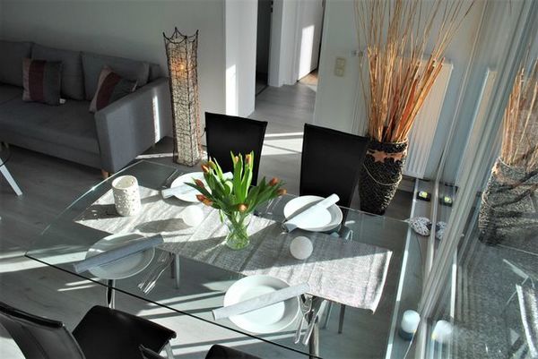 Beim Betreten der Fewo Penthouse am Wildpark sind Sie gleich im kombinierten Wohn-/Küchenbereich. Ein Esstisch an der riesigen Fensterfläche zur Dachterrasse lädt zum verweilen ein. Durch die großen Fenster können Sie selbst im Winter die Sonne genießen und sich entspannen. Für weitere 2 Personen steht ein Schlafsofa zur Verfügung.